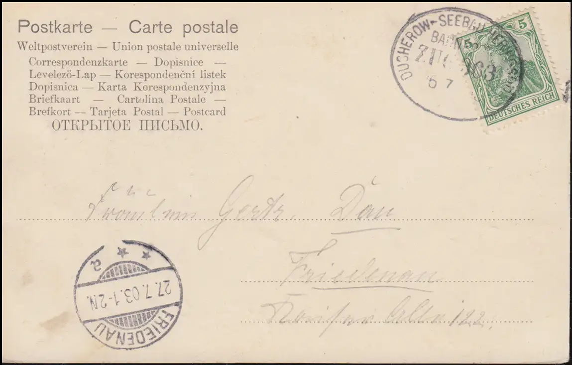 Post de train DUCHEROV - Seebad HERINGSDORF ZUG 363 - 26.7.1903 à AK Ahleck