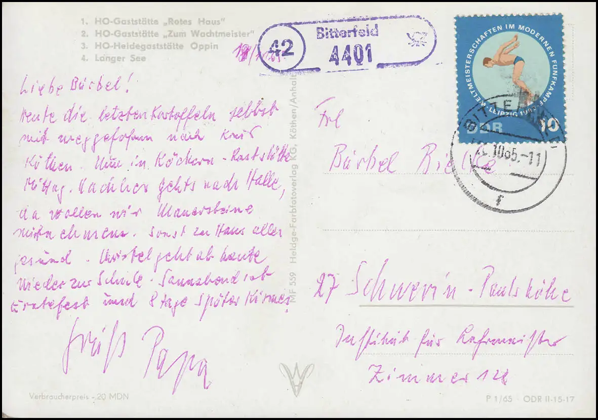 Post rural 42 BITTERFELD 4401 20.10.1965 sur la photo AK Gruss de Dübener Heide