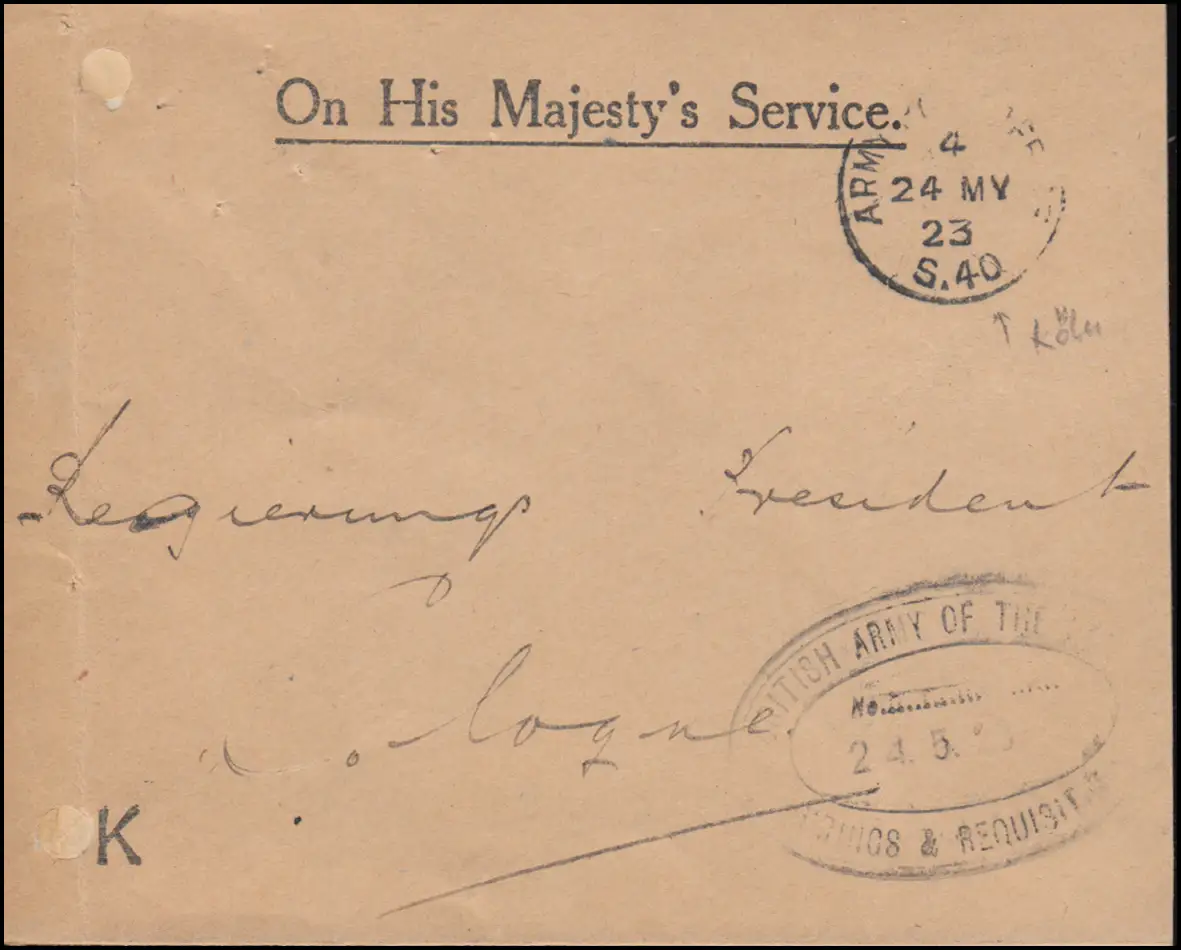 Lettre militaire "On His Majesty's Service" Cologne, violet Ovalstamp British ARMY OF THE RHINE 24.5.23, gauche (arrière-plan) Vérification: original Référence: 00000000002310