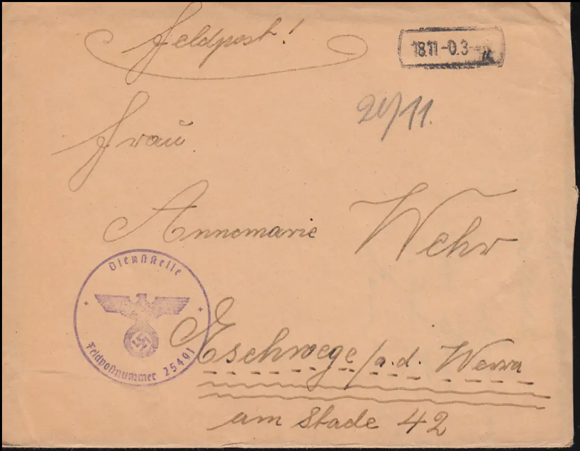Poste de champ BS Numéro de champs 25491 sur lettre avec cachet de couverture 18.11.(1940)