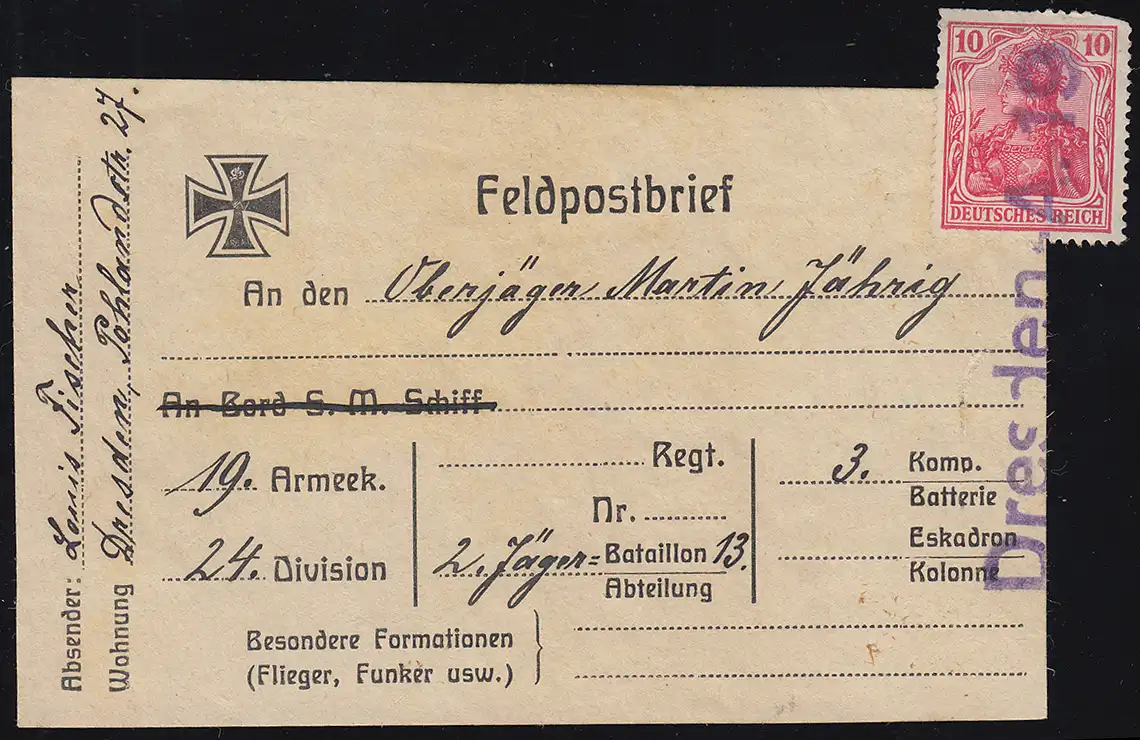 Poste de champ Dresde A 19 sur le colis avec Germania 10 Pennig