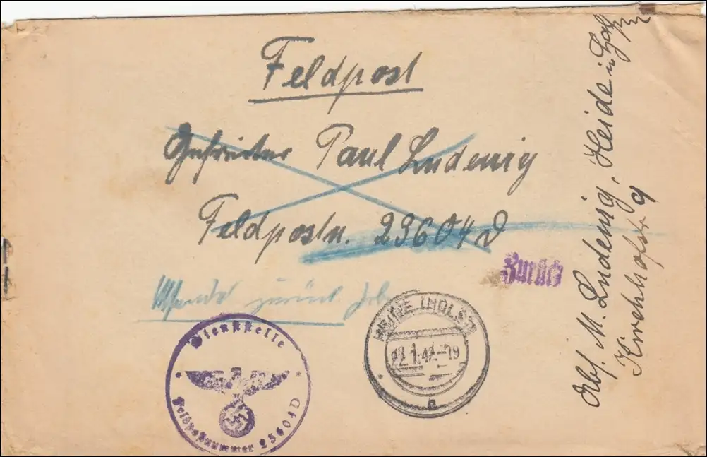Poste de champ II. Guerre mondiale: Lettre de Heide/Holstein à FPn° 29604A 1942 - retour