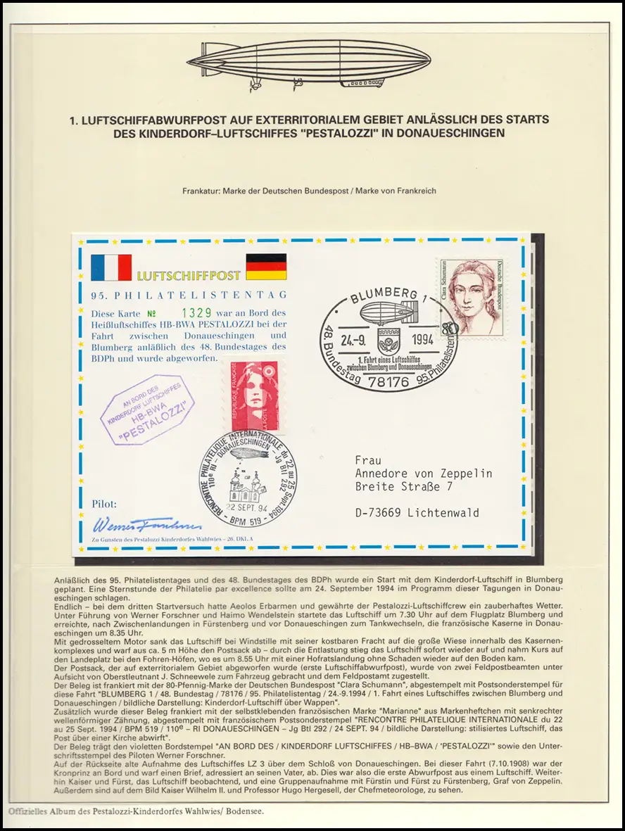 Poste de dirigeable DKL 26 PESTALOZZI HB-BWA au BdPh-Bundestag BLUMBERG 1994