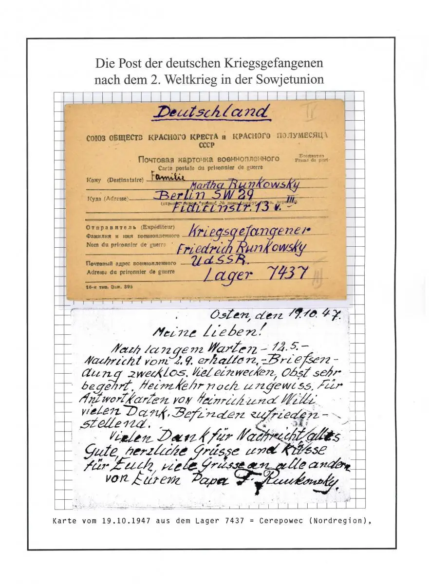 Poste de prisonniers de guerre Camp 7437 Tcherepovets Russie à Berlin du 19.10.1947