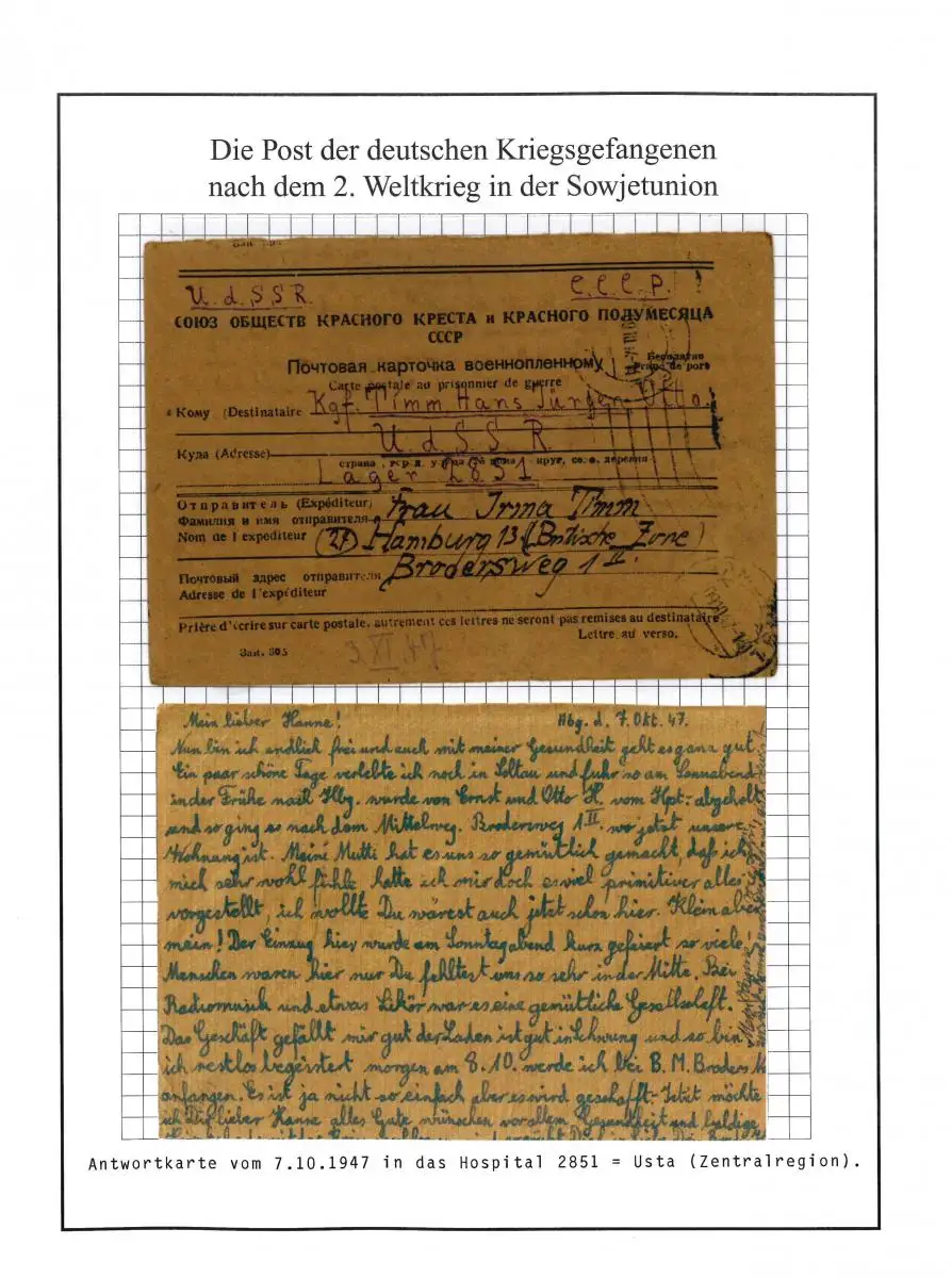 Poste de prisonniers de guerre Carte de réponse à l'hôpital 2851 Usta URSS Hambourg 9.10.1947