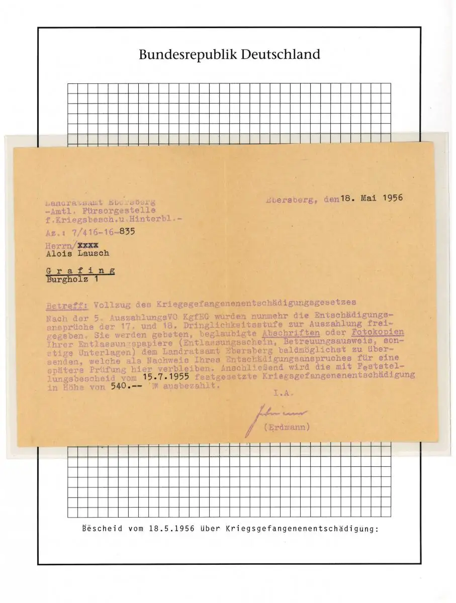 Poste de prisonniers de guerre Service d'assistance Ebersberg Décision Indemnisation 18.5.1956