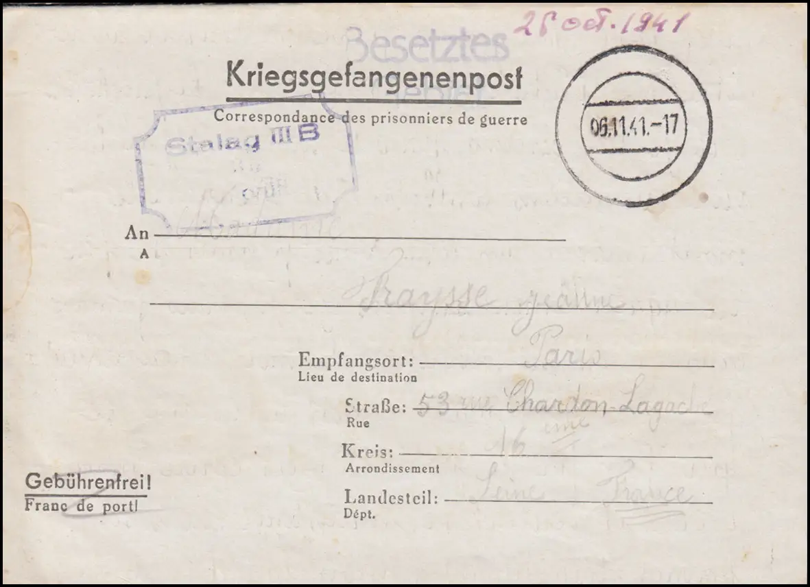Poste de prisonniers de guerre Stalag III B, timbre camouflage 6.11.1941 vers Paris / France