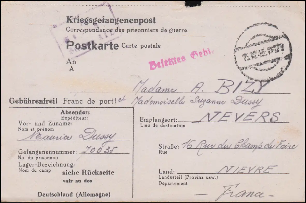Poste de prisonniers de guerre Stalag XI B, timbre-cadran 15.12.1943, vers la France