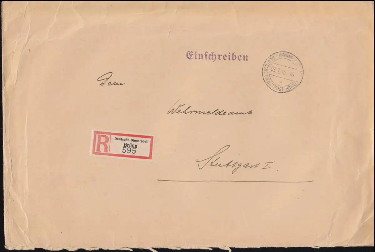 Poste de service allemand Böhmen et Moravie R-Bf. BRÜNN 3.7.40 selon STUTTGART