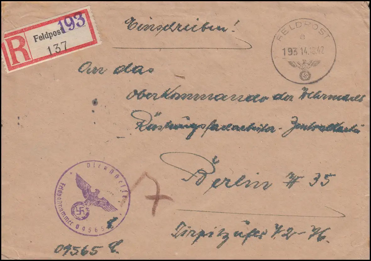 Poste de terrain 193 - 14.10.1942 sur lettre R Service 09565 vers BERLIN 2.11.42
