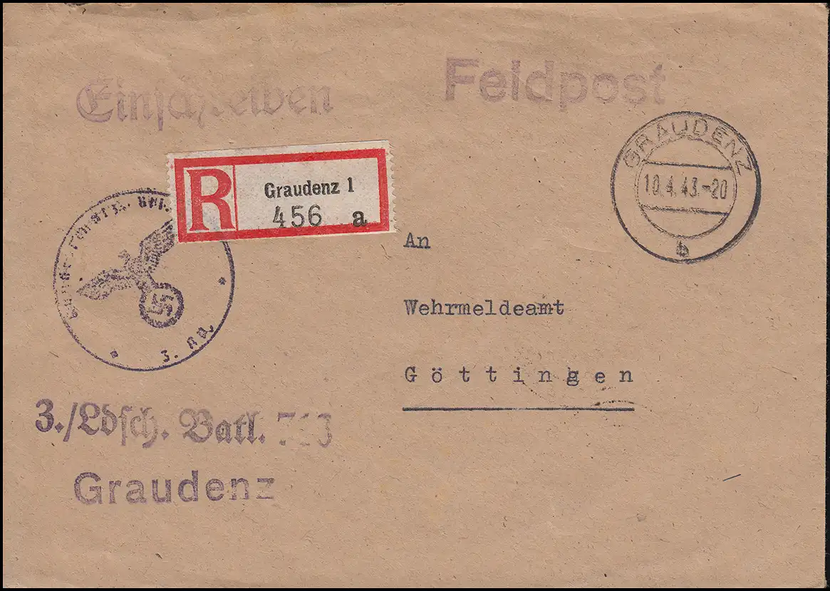 Poste de terrain 3. Batil. Grisdenz R-Lettre GRAUDENZ 10.4.43 après GÖTTINGEN