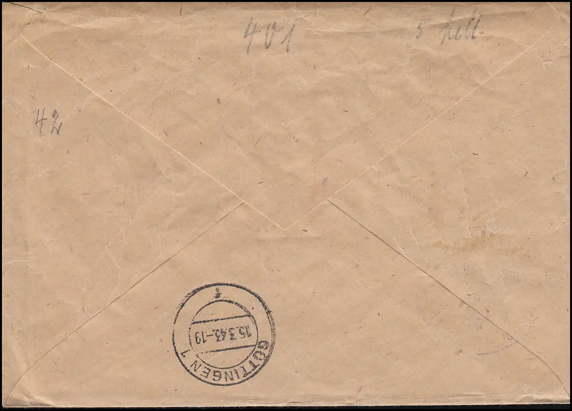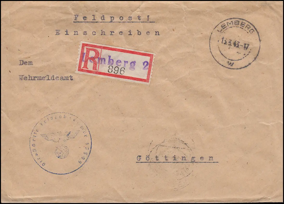 Poste de terrain 47599 R-Lettre Not-R-Zettel LEMBERG 2 - 15.3.43 vers GÖTTINGEN 15.3.43