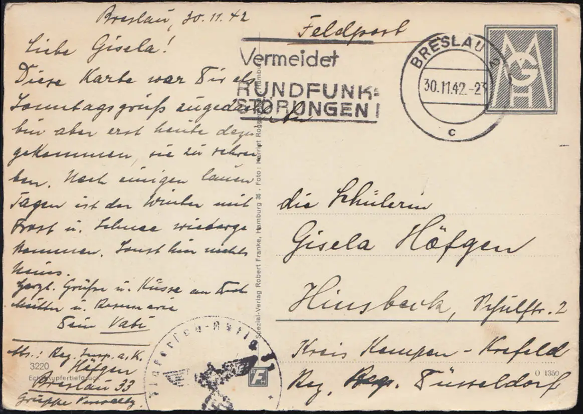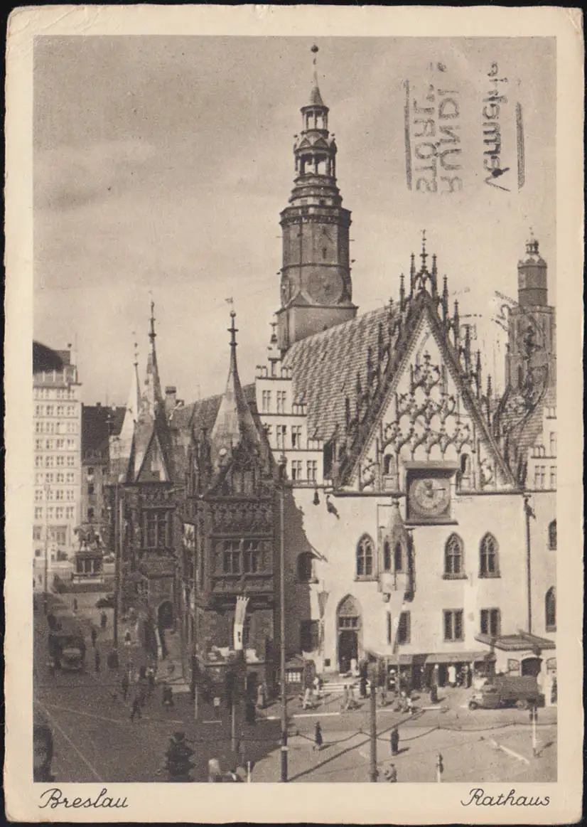 Poste de terrain AK Wroclaw Hôtel de ville avec timbre, BRESLAU 2 - 30.11.42