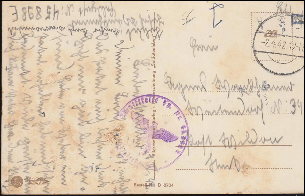 Poste de terrain BS 45898 D sur visite de terrains humor-AK, timbre camouflage 2.4.42