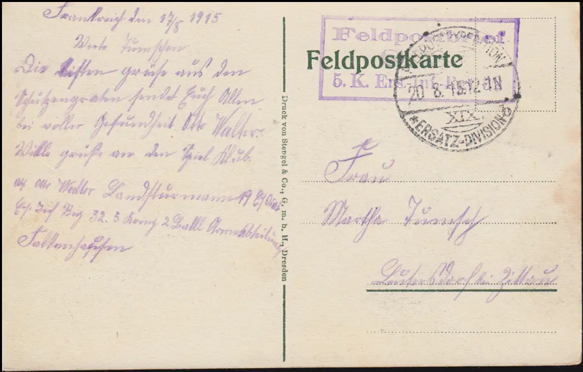 Poste de terrain BS 5. Comp. Régiment Ers. Infanterie 32 sur AK tranchées, 20.8.15