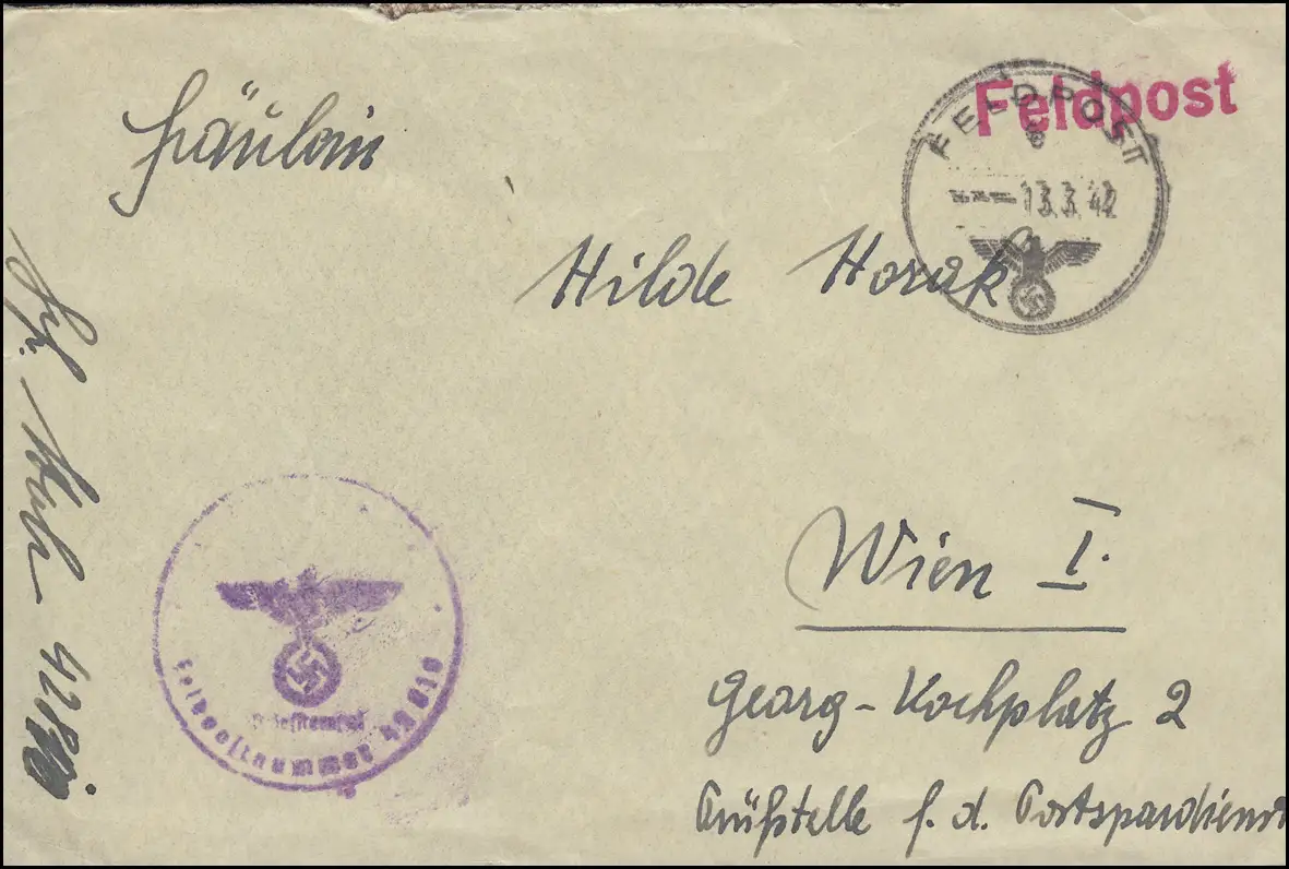 Poste de terrain BS FP n° 42810 sur lettre FELDPOST e 13.3.1942 à Vienne
