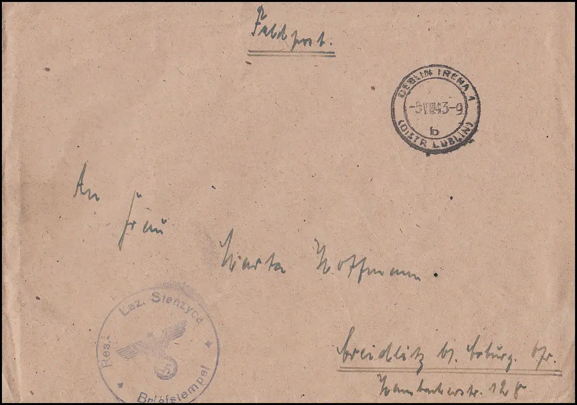 Poste de terrain BS Hôpital de réserve Stenzyca Lettre DEBLIN IRENA 1 (DISTR LUBLIN) 5.8.43