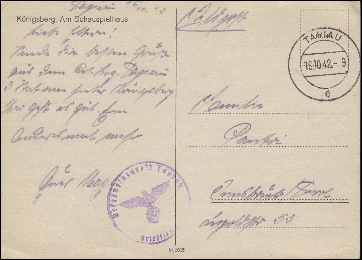 Poste de terrain BS Hôpital de réserve TAPIAU 16.10.1942 sur AK Königsberg Sauspielhaus