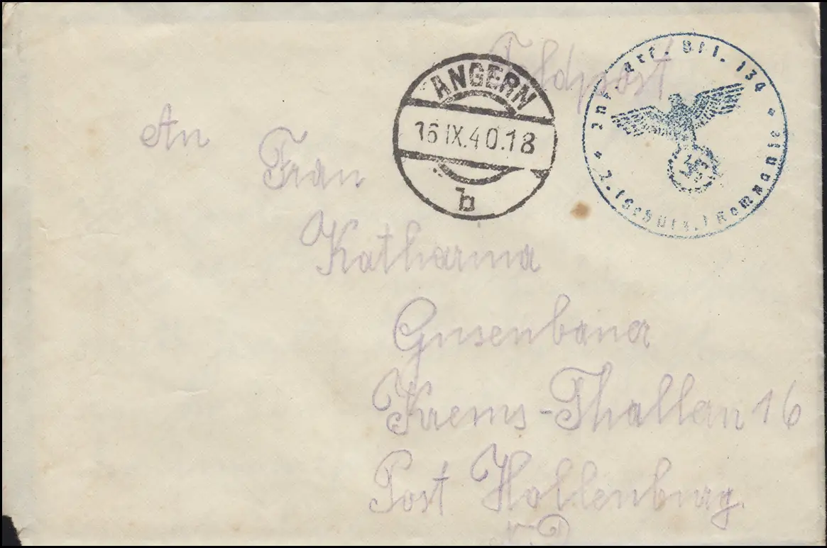 Poste de terrain BS Inf. E. Btl 134 sur lettre AGERN 16.9.1940 vers Krems-Thallern