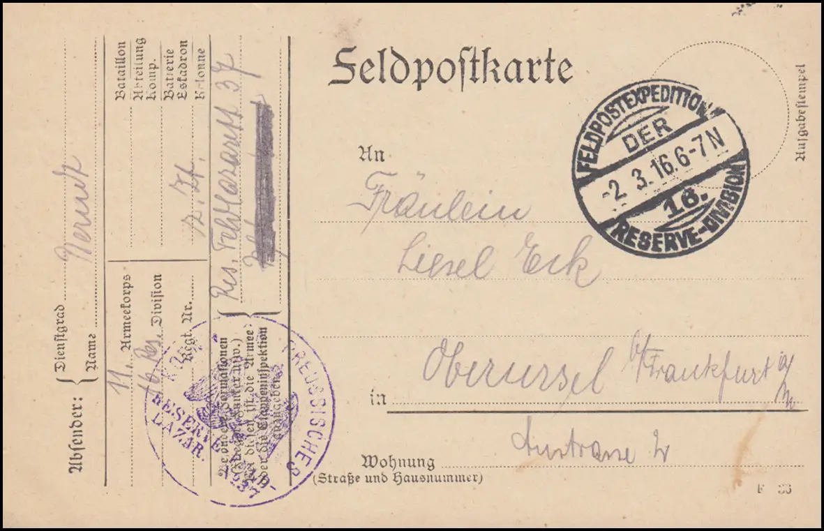 Tampon de poste FELDPOSTEXPÉDITION DE LA 16e DIGSION DE RÉSERVE 2.3.16, après la Haute-Cour Contrôle: original Référence produit: 00000000020396>Note: Cet article n'est disponible qu'une seule fois. Vous recevrez exactement l'article représenté.