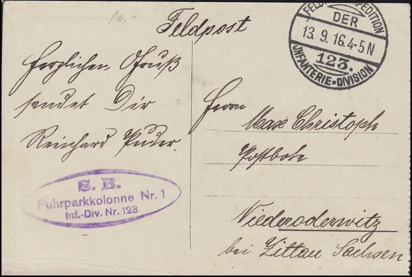 Poste de terrain Feldpost Fahrtparkkolonne Nr. 1 Inf.-Div. Nr 123, AK Swenzian FELDPOST 13.9.16