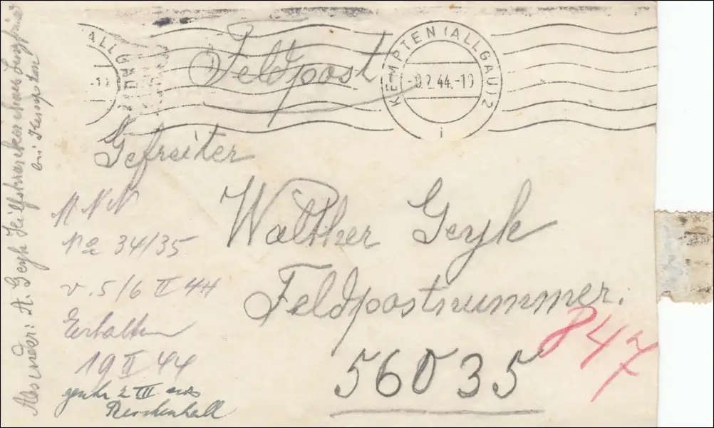 Poste de terrain II. Guerre mondiale: Kempten Lettre au FPn. 5603, 1944, Hongrie Front
