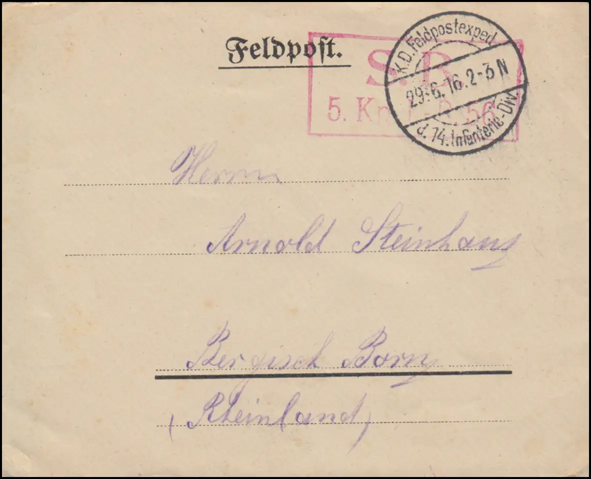 Poste de terrain I.WK rouge S.B. 5. Kp. J.R. 56 sur lettre 29.6.1916 vers Bergisch Born