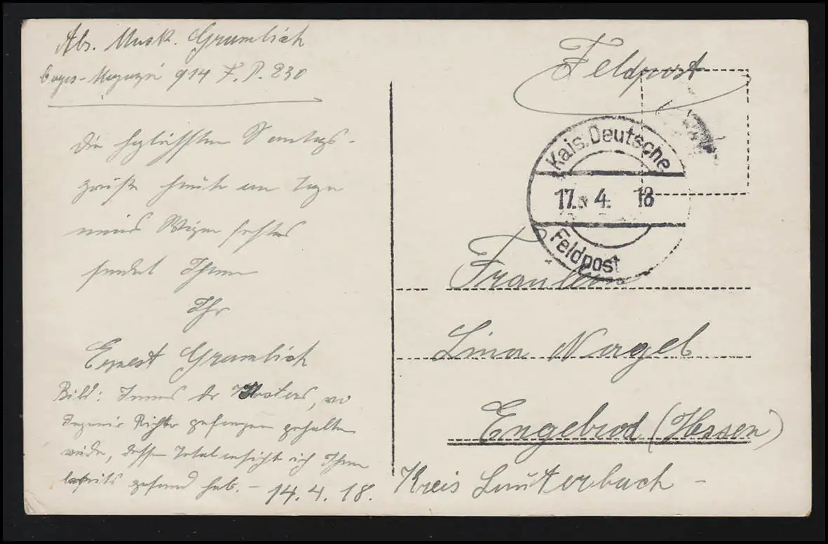 Poste de terrain Impérial Deutsche Feldpost 230 - 17.4.18 AK Balkan Kloster-Galerie