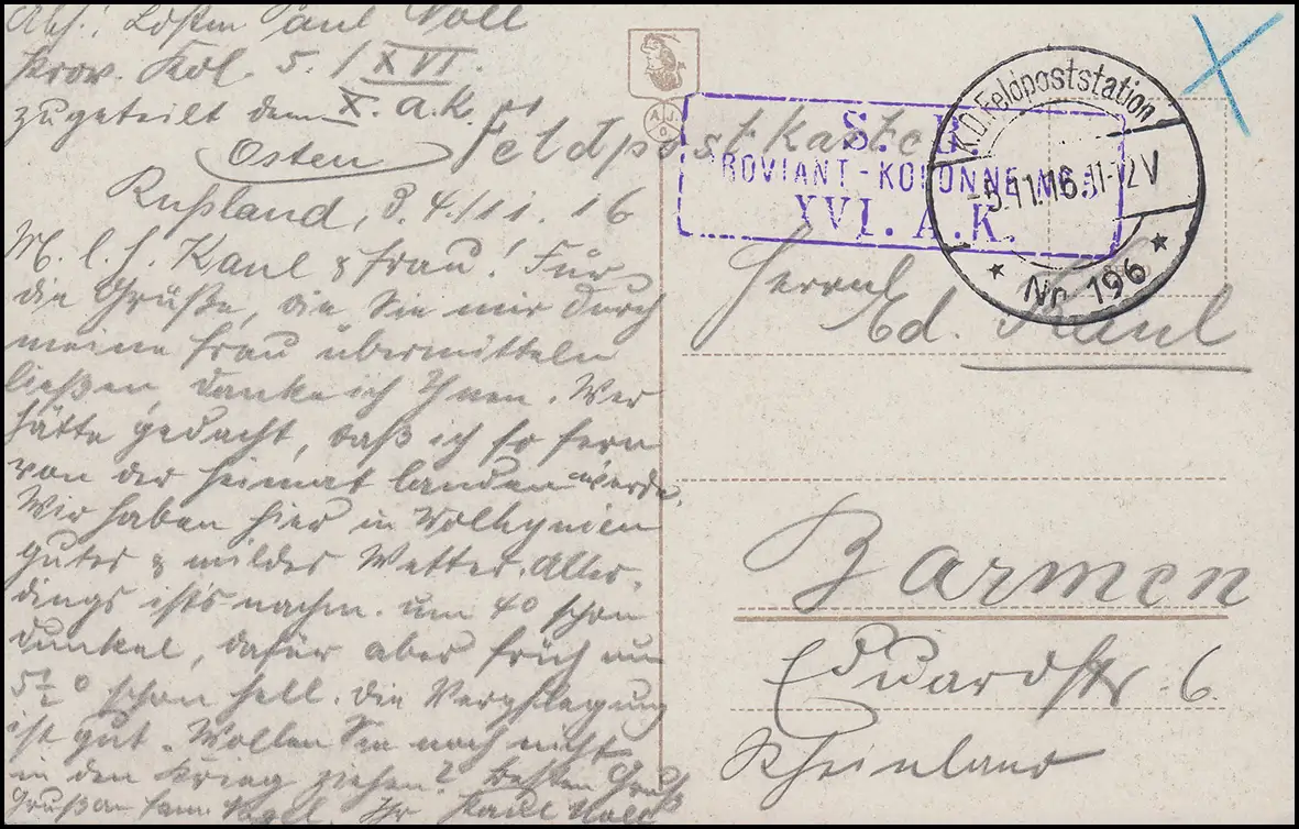 Poste de terrain PROVIANT-COLONNE 5 AK Paysage russe Poste du champ 196- 5.11.16