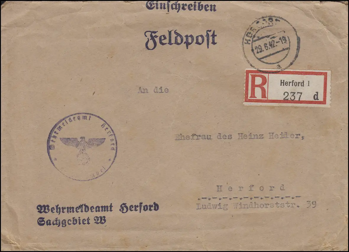 Poste de terrain Poste du lieu d'inscription Service de renseignement militaire HERFORD 1 a - 29.6.1942