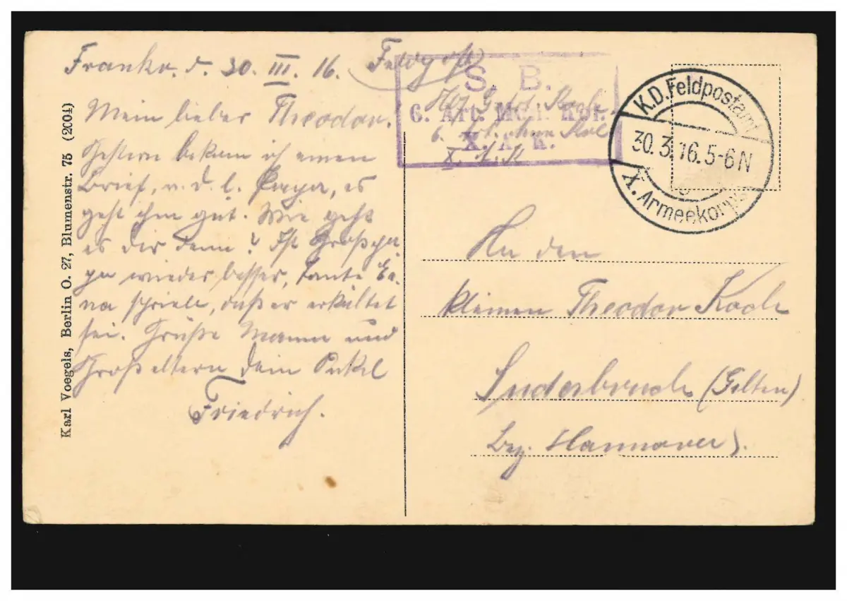Poste de terrain SB 6. Artillerie Colonne de munitions X. AK 30.3.1916 sur Ak espoir