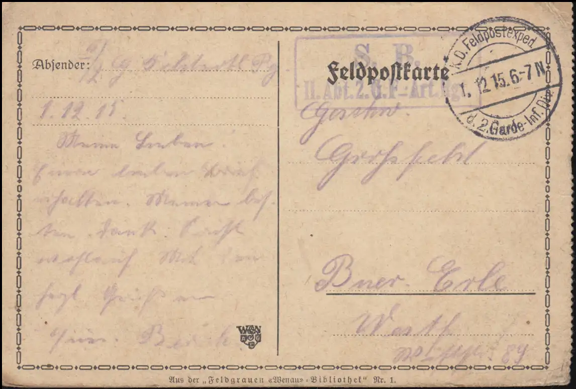 Poste de terrain SB II. Abbé 2. Régiment d'artillerie G.F., carte postale 1.12.1915