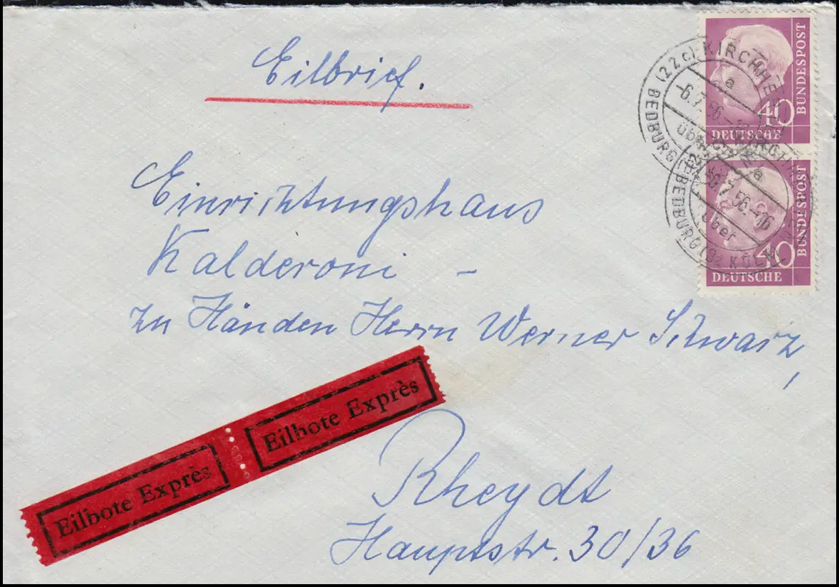 Envoi express / Express de KIRCHERTREN via BEDBURG (Bz KÖLN) 6.7.56 avec courrier ferroviaire vers RHEYDT 7.7.57.59.N° de catalogue: 188x Vérification: original Référence produit: 00000000026413>P>Remarque: Cet article n'est disponible qu'une seule fois. Vous recevrez exactement l'article représenté.