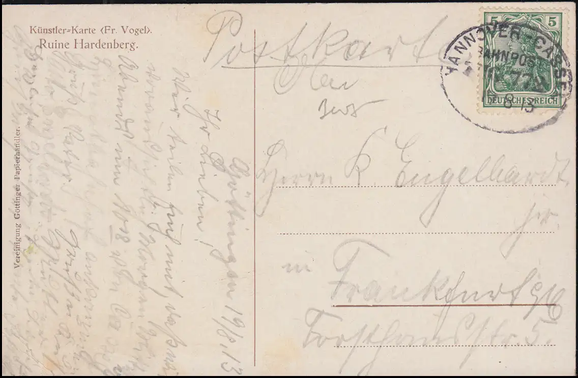 Poste ferroviaire HANNOVER-CASSEL ZUG 772 - 19.8.1913 sur AK Ruine Hardenberg