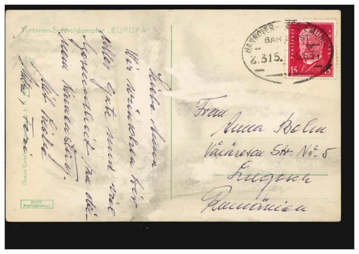 Poste ferroviaire HANNOVER-GEESTE ZUG 315 - 9.6.1931 sur Photo-AK vapeur EUROPE