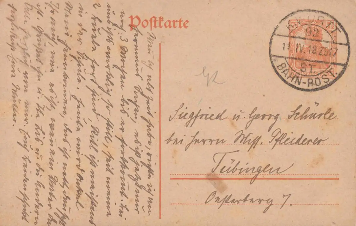 Poste ferroviaire K.WÜRTT. BAHN-POST 92 St. 11.4.1918 Train 917 sur carte postale à destination de Tübingen