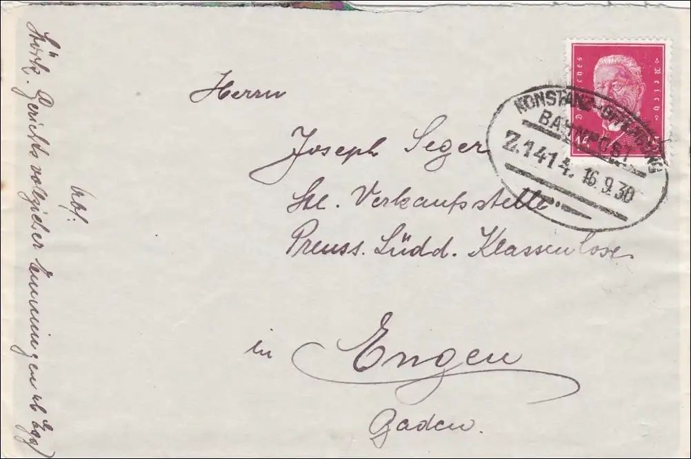 Poste ferroviaire: Lettre d'Emmendingen avec le cachet de la gare Constance-Offenburg 1930