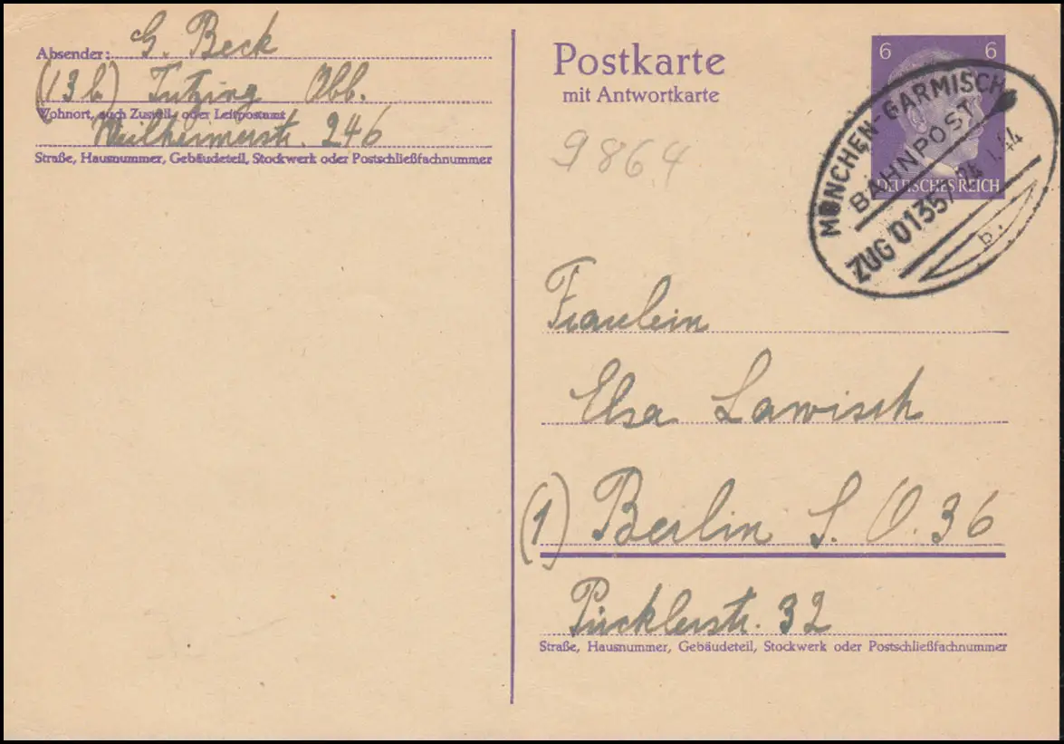 Poste ferroviaire MUNICH - GARMISCH ZUG 01357 - 24.1.1944 sur carte postale à Berlin