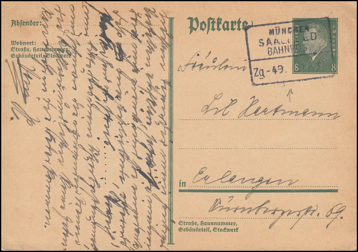 Poste ferroviaire MUNICH-SAALFELD ZUG 49 - 31.8.31 sur carte postale P 181I après acquisition