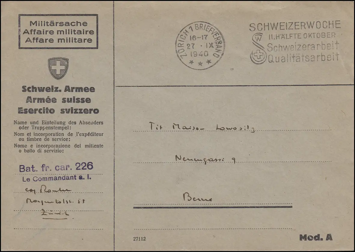 Poste militaire suisse Bat. fr. car. 226 Affaire militaire Publicité-O ZÜRICH 27.9.1940
