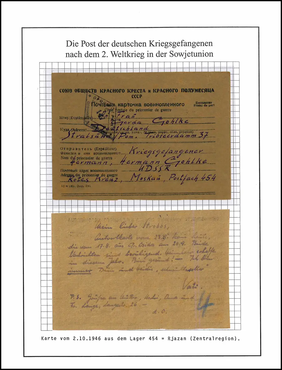 Poste prisonnier de guerre Carte Camp 454 Riazan URSS par Stralsund du 2.10.1946
