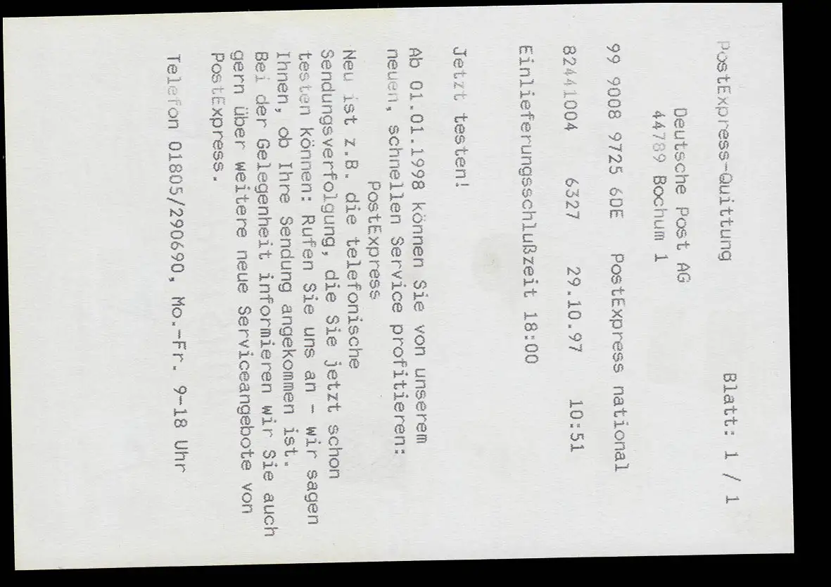 Postexpress: essai pilote NL Bochum Post Express-Standard Date de début 29.10.1997