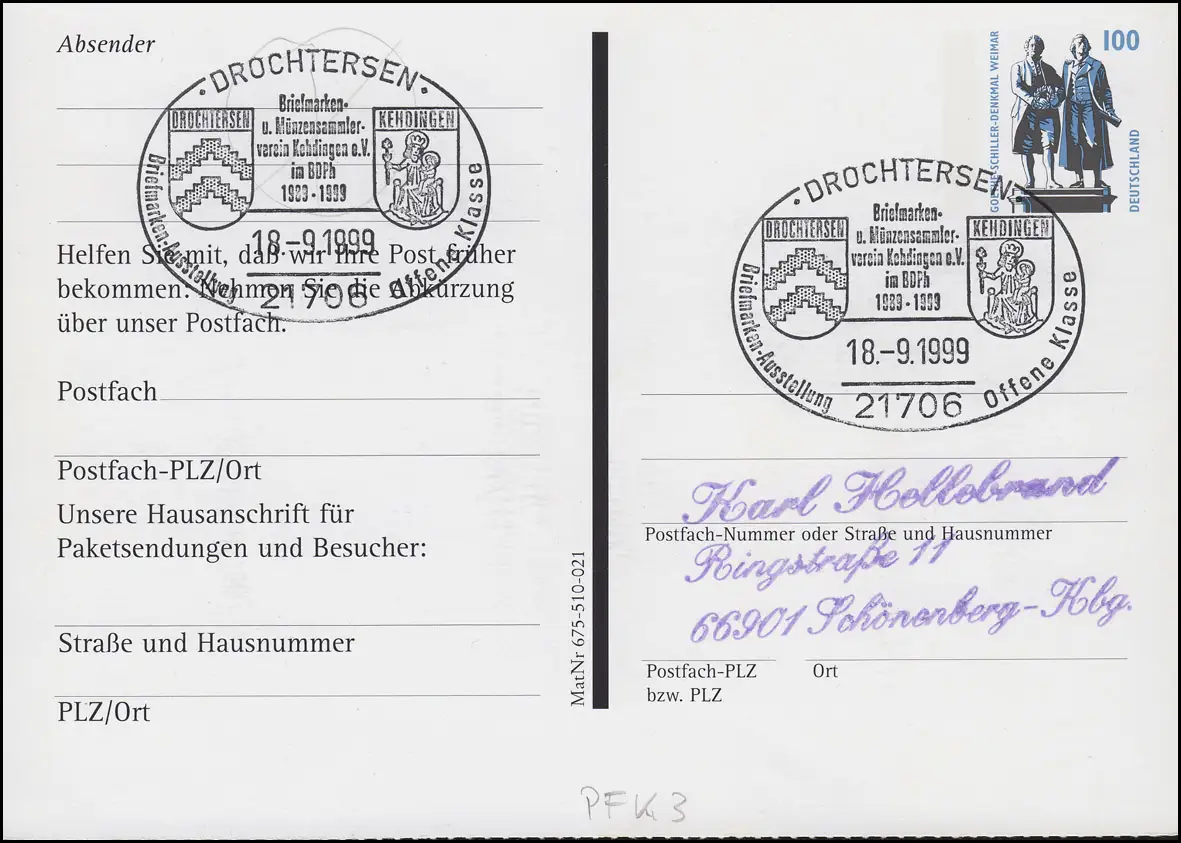 Postfach-PK PFK 3 SWK Grand réveil SSt DROKTENSEN 18.9.1999 vers Schönenberg