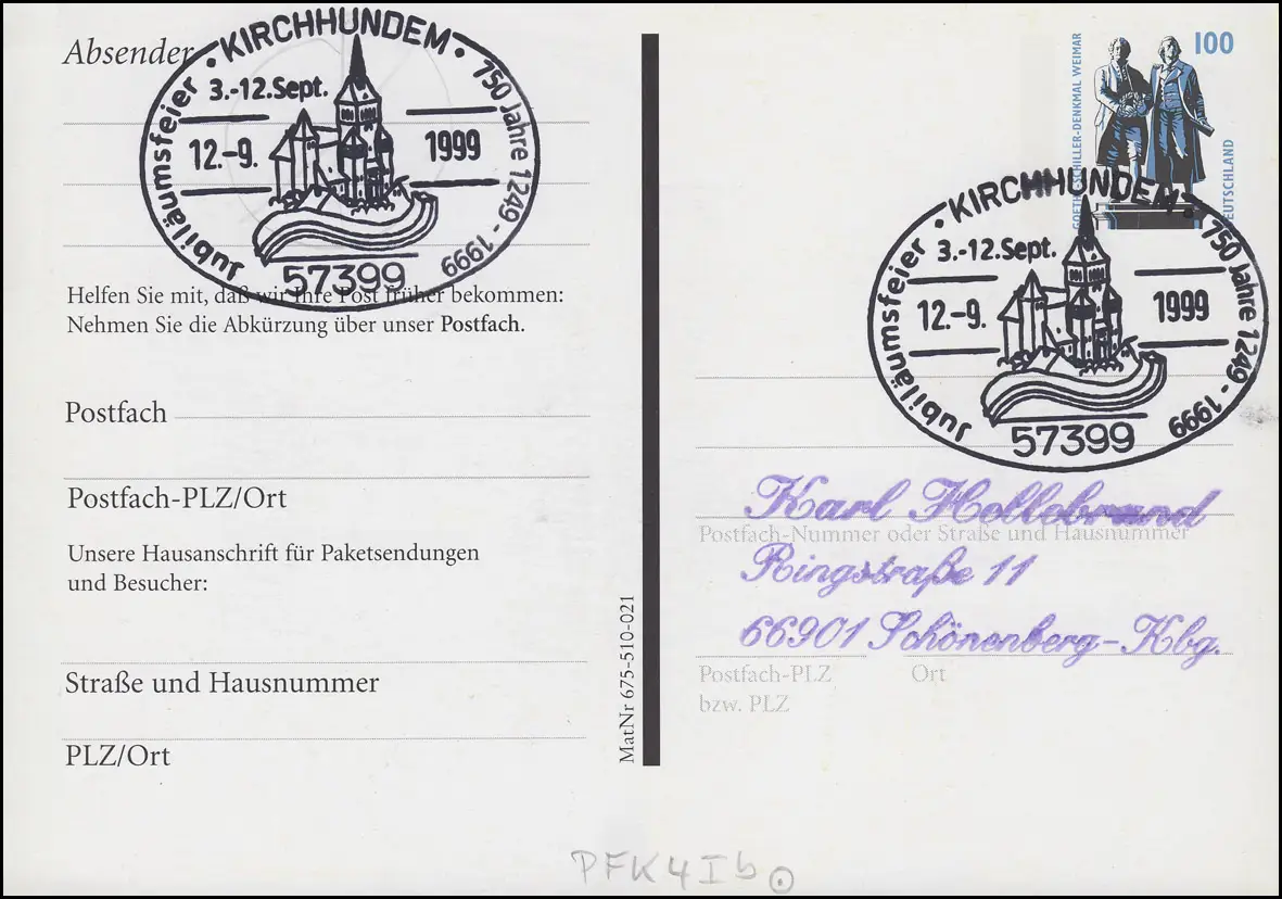 Postfach-PK PFK 4Ib SWK Kleiner Réveil SSt KIRCHUNDEM 12.9.99 vers Schönenberg