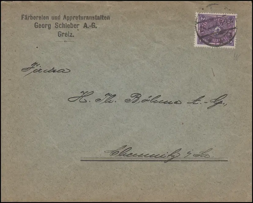 Posthorn 2 Mark bicolore EF F. Peinture Schleber GREIZ 24.2.22 selon Chemnitz