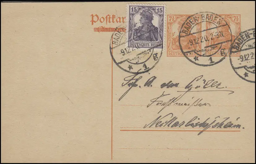 Carte postale 119A Germania 7 1/2 + 7/2 avec Germania 15 Pf BADEN-BADE 9.12.20