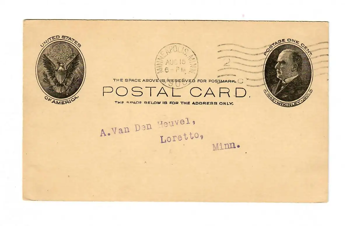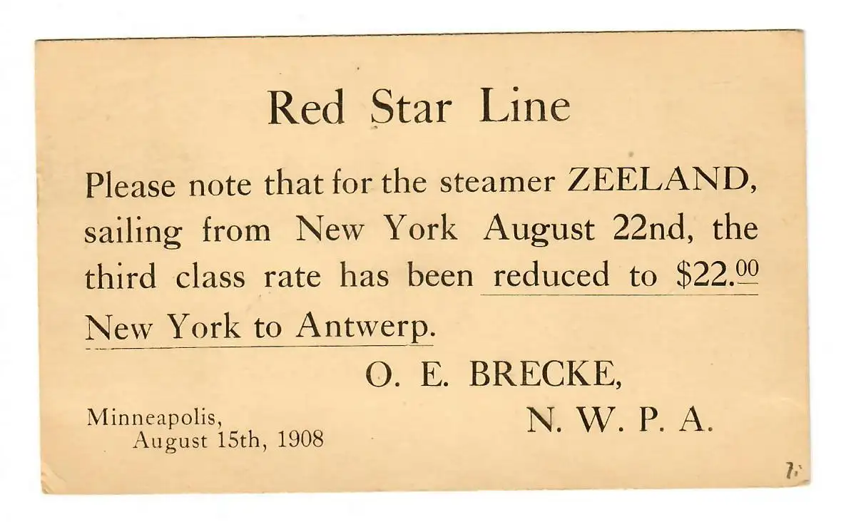 Carte postale 1908, Mineapolis/Minn vers Loretto: bateau à vapeur Zeeland Ticket Prix