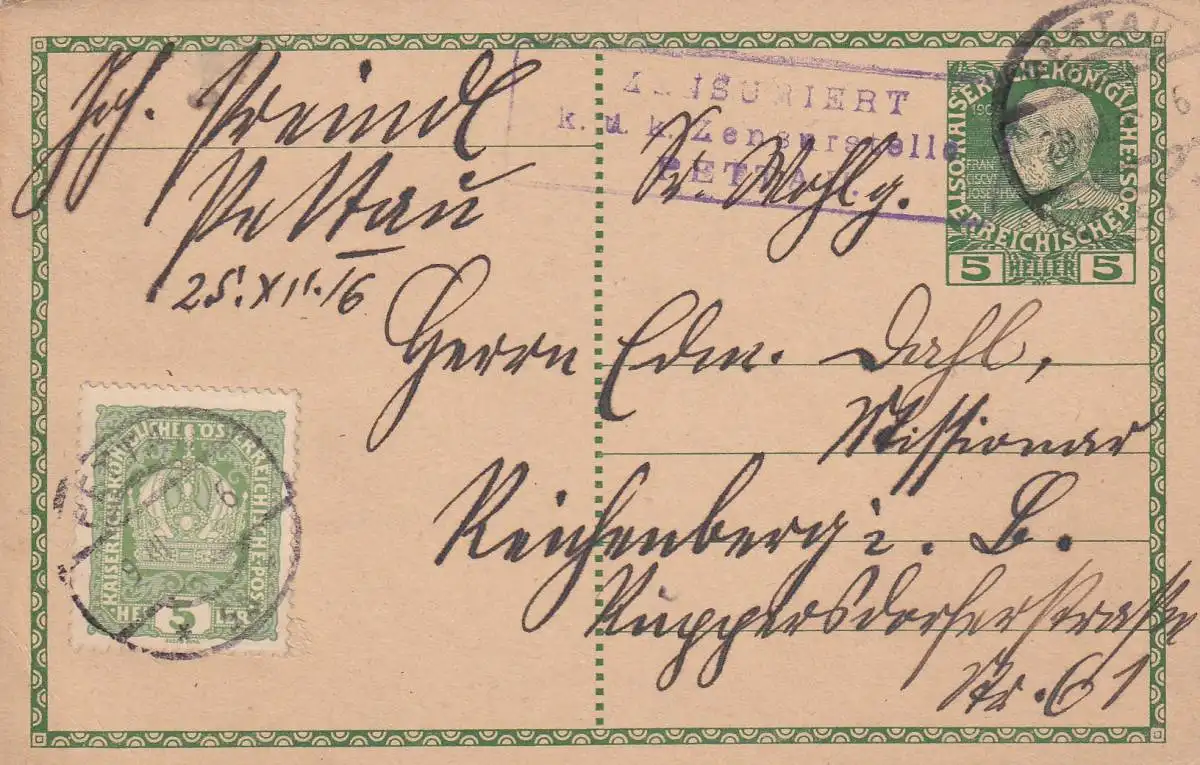 Carte postale 1916, Pettau, censure