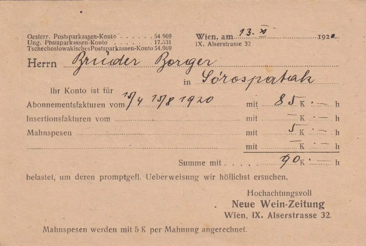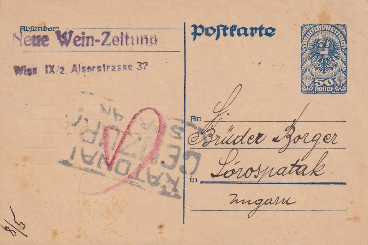 Carte postale 1920 Nouveau journal du vin après Hongrie, censure