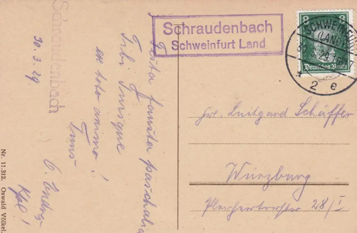 Carte postale 1929: Schraudenbach sur Schweinfurt Land vers Würzburg